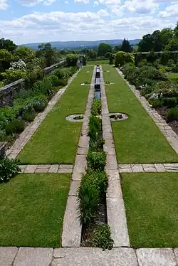 For the central garden element, the partially circular intertwined water channels, Gertrud Jekyll drew inspiration from the intricate patterns of traditional needlework. In addition, distinct Italianate and Moorish-Islamic influences are evident.[11][12]