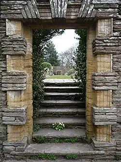 Lutyens was known for paying close attention to the materials used in his architectural designs. He liked to use regionally occurring types of stone for this purpose, as in the formal garden of Hestercombe Gardens. Here, the so-called "Ham-Hill stone", a warm sand-colored type of sandstone, was used to a great extent. This sandstone was used primarily to build niches, balustrades, stair railings, and the Orangery as a large structure. Locally occurring slate (native Lias, called Morte) was used on a larger scale, mainly for walls, stone slabs, step installations, or water basins.[8][9] Lutyens adopted the technique of building dry-stone walls using shale layers, a method commonly found in the southwest of England where the garden is located. Walls of this type could be planted over large areas without great difficulty, a circumstance that Jekyll took advantage of to further develop the connection between plants and architecture that is encountered time and again. The large pergola was also constructed of slate. The alternating square and round columns were layered from uniformly thin natural stones. As a further design element, the building material used was processed and used in different ways, such as quarry stone, finely cut, or polished.[9]