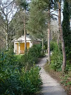 The English landscape garden from the second half of the 18th century stands as the earliest garden within Hestercombe Gardens. This garden was crafted between 1750 and 1786 under the stewardship of the estate's then-owner, Coplestone Warre Bampfylde. Covering just over 16 acres, the Georgian landscape park is situated in a valley to the north of the manor house. Bampfylde himself envisioned and designed the landscape garden, drawing inspiration from the contemporary "Arcadian style", which was highly fashionable at the time. In these gardens, the emphasis was less on ornamental plants and more on creating specific atmospheres and viewpoints that harmonized with the surrounding landscape. Trees and shrubs were employed to evoke moods and vistas. The landscape garden included features like a cascade waterfall, seating areas at scenic spots, a small temple, as well as artificial ruins resembling a Greek-style temple and a mausoleum.[4]