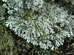 Heterodermia is a genus of foliose lichens in the family Physciaceae.[2] The genus has a widespread distribution, especially in tropical regions, and contains about 70 species. Heterodermia was historically confused with the related genus Anaptychia, but was distinguished in 1965 based on differences in spore structure and chemical composition. These lichens can be identified in the field using simple chemical spot tests that produce distinctive colour changes when applied to the thallus. The lichens in this genus are small- to medium-sized, usually pale grey in colour, comprising narrow lobes with widened tips fringed with cilia. The lichens can be identified by their thick-walled ascospores and the presence of specific chemical compounds (lichen products) that produce colour reactions when spot tested. Most species are found in tropical and subtropical regions around the world, commonly growing on tree bark in mountain forests. Heterodermia species support a rich community of specialized parasitic fungi, with over 20 different species known to grow specifically on these lichens. Some species have traditional uses in medicine and cooking, particularly in India, Nepal, and Brazil.
