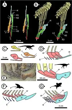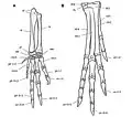 The shoulder blade was capped by an additional element, the suprascapula, which is, among dinosaurs, otherwise only known from Parksosaurus. In the chest region, Heterodontosaurus possessed a well-developed pair of sternal plates that resembled those of theropods, but was different from the much simpler sternal plates of other ornithischians. The sternal plates were connected to the rib cage by elements known as sternal ribs. In contrast to other ornithischians, this connection was moveable, allowing the body to expand during breathing. Heterodontosaurus is the only known ornithischian that possessed gastralia (bony elements within the skin between the sternal plates and the pubis of the pelvis). The gastralia were arranged in two lengthwise rows, each containing around nine elements.[13] The pelvis was long and narrow, with a pubis that resembled those possessed by more advanced ornithischians.[28][1][29]