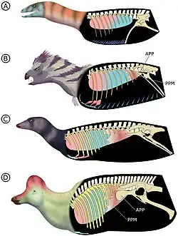 Dinosaurs likely possessed an air sac system as found in modern birds, which ventilated an immobile lung. Air flow was generated by contraction of the chest, which was allowed by mobile sternal ribs and the presence of gastralia. Extensions of the air sacs also invaded bones, forming excavations and chambers, a condition known as postcranial skeletal pneumaticity. Ornithischians, with the exception of Heterodontosaurus, lacked mobile sternal ribs and gastralia, and all ornithischians (including Heterodontosaurus) lacked postcranial skeletal pneumaticity. Instead, ornithischians had a prominent anterior extension of the pubis, the anterior pubic process (APP), which was absent in other dinosaurs. Based on synchrotron data of a well-preserved Heterodontosaurus specimen (AM 4766), Viktor Radermacher and colleagues, in 2021, argued that the breathing system of ornithischians drastically differed from that of other dinosaurs, and that Heterodontosaurus represents an intermediate stage. According to these authors, ornithischians lost the ability to contract the chest for breathing, and instead relied on a muscle that ventilated the lung directly, which they termed the puberoperitoneal muscle. The APP of the pelvis would have provided the attachment site for this muscle. Heterodontosaurus had an incipient APP, and its gastralia were reduced compared to non-ornithischian dinosaurs, suggesting that the pelvis was already involved in breathing while chest contraction became less important.[13]