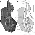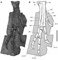 The neck consisted of nine cervical vertebrae, which would have formed an S-shaped curve, as indicated by the shape of the vertebral bodies in the side view of the skeleton. The vertebral bodies of the anterior cervical vertebrae are shaped like a parallelogram, those of the middle are rectangular and those of the posterior show a trapezoid shape.[22][7] The trunk was short, consisting of 12 dorsal and 6 fused sacral vertebrae.[22] The tail was long compared to the body; although incompletely known, it probably consisted of 34 to 37 caudal vertebrae. The dorsal spine was stiffened by ossified tendons, beginning with the fourth dorsal vertebra. This feature is present in many other ornithischian dinosaurs and probably countered stress caused by bending forces acting on the spine during bipedal locomotion. In contrast to many other ornithischians, the tail of Heterodontosaurus lacked ossified tendons, and was therefore probably flexible.[7]