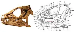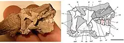 The skull of Heterodontosaurus was small but robustly built. The two most complete skulls measured 108 mm (4 in) (holotype specimen SAM-PK-K337) and 121 mm (5 in) (specimen SAM-PK-K1332) in length. The skull was elongated, narrow, and triangular when viewed from the side, with the highest point being the sagittal crest, from where the skull sloped down towards the snout tip. The back of the skull ended in a hook-like shape, which was offset to the quadrate bone. The orbit (eye opening) was large and circular, and a large spur-like bone, the palpebral, protruded backwards into the upper part of the opening. Below the eye socket, the jugal bone gave rise to a sideways projecting boss, or horn-like structure. The jugal bone also formed a "blade" that created a slot together with a flange on the pterygoid bone, for guiding the motion of the lower jaw. Ventrally, the antorbital fossa was bounded by a prominent bony ridge, to which the animal's fleshy cheek would have been attached.[1] It has also been suggested that heterodontosaurs and other basal (or "primitive") orhithischians had lip-like structures like lizards do (based on similarities in their jaws), rather than bridging skin between the upper and lower jaws (such as cheeks).[26] The proportionally large lower temporal fenestra was egg-shaped and tilted back, and located behind the eye opening. The elliptical upper temporal fenestra was visible only looking at the top of the skull. The left and right upper temporal fenestrae were separated by the sagittal crest, which would have provided lateral attachment surfaces for the jaw musculature in the living animal.[1]