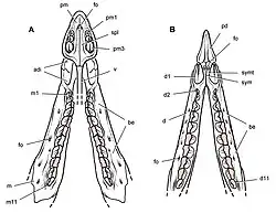 The lower jaw tapered towards the front, and the dentary bone (the main part of the lower jaw) was robust. The front of the jaws were covered by a toothless keratinous beak (or rhamphotheca). The upper beak covered the front of the premaxilla bone and the lower beak covered the predentary, which are, respectively, the foremost bones of the upper and lower jaw in ornithischians. This is evidenced by the rough surfaces on these structures. The palate was narrow, and tapered towards the front. The external nostril openings were small, and the upper border of this opening does not seem to have been completely bridged by bone. If not due to breakage, the gap may have been formed by connective tissue instead of bone. The antorbital fossa, a large depression between the eye and nostril openings, contained two smaller openings. A depression above the snout has been termed the "nasal fossa" or "sulcus". A similar fossa is also seen in Tianyulong, Agilisaurus, and Eoraptor, but its function is unknown.[22][1][25]