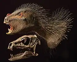 Following the description of the related Tianyulong in 2009, which was preserved with hundreds of long, filamentous integuments (sometimes compared to bristles) from neck to tail, Heterodontosaurus has also been depicted with such structures, for example in publications by the palaeontologists Gregory S. Paul and Paul Sereno. Sereno has stated that a heterodontosaur may have looked like a "nimble two-legged porcupine" in life.[8][24] The restoration published by Sereno also featured a hypothetical display structure located on the snout, above the nasal fossa (depression).[25]