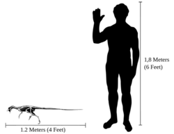 Heterodontosaurus was a small dinosaur. The most complete skeleton, SAM-PK-K1332, belonged to an animal measuring about 1.18 m (3 ft 10 in) in length. Its weight was variously estimated at 1.8 kg (4.0 lb), 2.59 kg (5.7 lb), and 3.4 kg (7.5 lb) in separate studies.[18][8] The closure of vertebral sutures on the skeleton indicates that the specimen was an adult, and probably fully grown. A second specimen, consisting of an incomplete skull, indicates that Heterodontosaurus could have grown substantially larger – up to a length of 1.75 m (5 ft 9 in) and with a body mass of nearly 10 kg (22 lb). The reason for the size difference between the two specimens is unclear, and might reflect variability within a single species, sexual dimorphism, or the presence of two separate species.[8][19] The size of this dinosaur has been compared to that of a turkey.[20] Heterodontosaurus was amongst the largest known members of the family Heterodontosauridae.[21] The family contains some of the smallest known ornithischian dinosaurs – the North American Fruitadens, for example, reached a length of only 65 to 75 cm (26 to 30 in).[22][23]