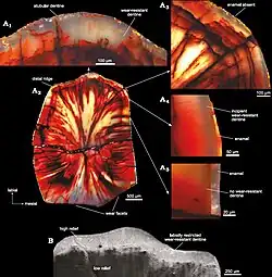 The canines had fine serrations along the back edge, but only the lower ones were serrated at the front. Eleven tall and chisel-like cheek-teeth lined each side of the posterior parts of the upper jaw, which were separated from the canines by a large diastema (gap). The cheek-teeth increased gradually in size, with the middle teeth being largest, and decreased in size after this point. These teeth had a heavy coat of enamel on the inwards side, and were adapted for wear (hypsodonty), and they had long roots, firmly embedded in their sockets. The tusks in the lower jaw fit into an indentation within the diastema of the upper jaw. The cheek-teeth in the lower jaw generally matched those in the upper jaw, though the enamel surface of these were on the outwards side. The upper and lower teeth rows were inset, which created a "cheek-recess" also seen in other ornithischians.[22][1] Despite the different types of teeth, their histology and enamel microstructure was not complex. But while the enamel thinned out towards the outer surface of the teeth, a thick band of wear-resistant dentine arose concurrently with the thinning enamel, and formed the cutting crest of the occlusal surface, a roletypically filled by enamel.[27]
