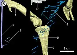 The hindlimbs were long, slender, and ended in four toes, the first of which (the hallux) did not contact the ground. Uniquely for ornithischians, several bones of the leg and foot were fused: the tibia and fibula were fused with upper tarsal bones (astragalus and calcaneus), forming a tibiotarsus, while the lower tarsal bones were fused with the metatarsal bones, forming a tarsometatarsus.[22] This constellation can also be found in modern birds, where it has evolved independently.[2] The tibiotarsus was about 30% longer than the femur.[22] The ungual bones of the toes were claw-like, and not hoof-like as in more advanced ornithischians.[8]