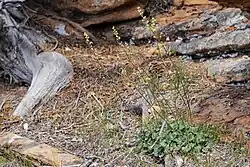 Heuchera parvifolia is a variable species, and has many proposed varieties, although these are not generally agreed upon.[1] It has ovate to circular cordate leaves that are up to about 6 centimeters in length.[2] It blooms from May to September,[3] producing a 20–75 centimeter-long panicle of whitish, yellowish, or greenish flowers.[2][3]