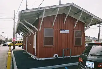 ![]() The 2003 Hewlett station building in 2009, across the tracks and the grade crossing from the long-standing former station. | ||||||||||||||||||