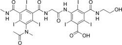 Ioxaglic acid (trade name Hexabrix) is pharmaceutical drug used as an iodinated contrast medium for X-ray imaging. It has low osmolality (relatively few molecules per volume), typically resulting in fewer side effects than high-osmolality media.[1] It is manufactured by Guerbet, but marketing in the US has been discontinued.[2] As of 2021, it may still be available in some European countries.[3]