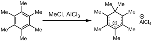 Treatment of hexamethylbenzene with a superelectrophilic mixture of methyl chloride and aluminum trichloride (a source of Meδ⊕Cl---δ⊖AlCl3) gives heptamethylbenzenium cation, one of the first carbocations to be directly observed.