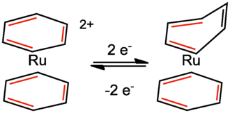In the field of organoruthenium chemistry, the redox interconversion of the analogous two-electron reduction of the dication and its neutral product occurs at −1.02 V in acetonitrile[7] and is accompanied by a structural change.[8][42] The hapticity of one of the hexamethylbenzene ligands changes with the oxidation state of the ruthenium centre, the dication [Ru(η6-C6(CH3)6)2]2+ being reduced to [Ru(η4-C6(CH3)6)(η6-C6(CH3)6)],[8] with the structural change allowing each complex to comply with the 18-electron rule and maximise stability.