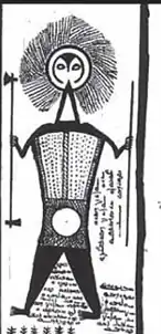 Hibil Ziwa (ࡄࡉࡁࡉࡋ ࡆࡉࡅࡀ, sometimes translated "Splendid Hibel")[4] is spoken of as a son of Manda d-Hayyi who was created by Hayyi, as stated in the Right Ginza book 4, verse 2; "When the First Life thought and created Manda d-Hiia and Manda d-hiia created Hibil-Ziwa...".[5] And Hibil, the man, is spoken of as a brother to Anush (Enosh) and to Shitil (Seth),[6] who is the son of Adam.[7] Elsewhere, Anush is spoken of as the son of Shitil, and Shitil as the son of Hibil, where Hibil came to Adam and Eve as a young boy when they were still virgins, but was called their son.[8] Hibil Ziwa is an important lightworld being (uthra) who conquered the World of Darkness.[9] As Yawar Hibil, he is one of multiple figures known as Yawar (Classical Mandaic: ࡉࡀࡅࡀࡓ, lit. 'Helper'), being so named by and after his father.[6] Brikha Nasoraia (2022)[10]: 34 and Sandra van Rompaey (2011)[11] note many resemblances between the Aramean deity Yarhibol and Yawar Hibil, in terms of both the names and artistic representations.