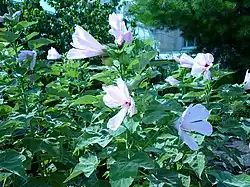 H. grandiflorus is a woody perennial which can reach 6 feet (1.8 m) on average.[5] Extreme heights of 15 feet (4.6 m) are known.[4] It has pink to white flowers with a reddish purple center and yellow stamens. Flowers are generally greater than 6 inches (15 cm) in diameter.[4] Its capsules are covered in velvety trichomes.[5]