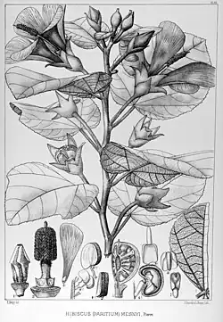 Pierre's original description notes that this tree "inhabits the Dong Nai basin and its tributary the Song Be,"[1] which appears to remain its known distribution.[2][3] Pierre described the species as a tree of 8–12 metres (26–39 ft) height, growing in large groups. Also named "Paritium", this species was thought to be peculiar in that its "bracteoles are quite often deciduous, and that their attachment is such that the apical lobes must be considered as clefts. This character largely distinguishes it from [the similar] "H. floccossus" Mast., inhabiting the Malay Peninsula [now also recorded from Thailand], which has very similar leaves."