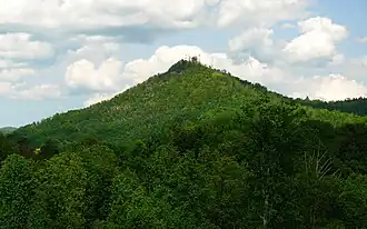 Hibriten Mountain, located just east of Lenoir, North Carolina, marks the western end of the Brushy Mountains range. At 2,211 feet, the mountain's summit is nearly 1,000 feet above the surrounding terrain. The summit is well known to the locals for its large welcome light which glows at night in the shape of a star in the weeks before Christmas and a cross before Easter.