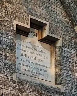 A plaque over the entrance records that the almshouses were built "for Ten poor Men and Ten poor Women by the bounty of William Hickey Esq. Who by his Will bequeathed certain Lands and houses in Richmond in Trust for Charitable purposes".[1] William Hickey,[note 1] who died in 1727 and is buried in an altar tomb in the churchyard of St Mary Magdalene, Richmond, left the income of several properties on Richmond Hill, including The Wick, in trust to provide pensions for six men and ten women.[2][3] In 1822 the charity's funds were boosted by a major donation by Elizabeth Doughty.[4]