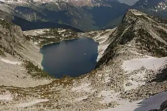 Hidden Lake is located immediately east of Hidden Lake Peaks in North Cascades National Park, in the U. S. state of Washington.[2] Hidden Lake is off designated trails but can reached by way a trailhead off the Cascade River Road from Snoqualmie National Forest.[3] The distance from the trailhead to the lake is 4.5 mi (7.2 km) one way to the overlook and another 0.8 mi (1.3 km) rock scramble through a boulder field to the lakeshore.[4]