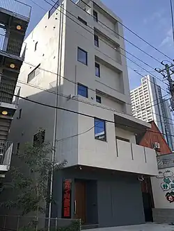 Located in Higashimukōjima, Sumida, the new stable had a groundbreaking ceremony in November 2023 and was completed in November 2024.[8] Its official inauguration took place in April 2025, in the presence of the two directors of the Nishonoseki ichimon at the time (Takadagawa and Sadogatake).[9] The building has five floors, the first of which serves as the training ground and the second as the dining and bathroom facilities. The third as the dormitories and private rooms for the sekitori, and the fourth as a gym and office.[7] The fifth floor houses the private apartments of the master and his family.[7][9] The stable's training ring was designed to be seen from the adjacent nursing home.[7][10] Its sign is made of cypress and was created using a wajima-nuri lacquer method with a bright red color to ward off evil spirits.[8] The sign was originally assembled in Wajima, Ishikawa and was saved in the craftsman's workshop after the 2024 Noto earthquake.[7]