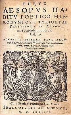 Hieronymus Osius was a German Neo-Latin poet and academic about whom there are few biographical details. He was born about 1530 in Schlotheim and murdered in 1575 in Graz. After studying first at the university of Erfurt, he gained his master's degree from Wittenberg University in 1552 and later lectured on Poetics in the Philosophical faculty there. In 1558 he was crowned poet laureate in Copenhagen by King Christian III of Denmark. Thereafter he held teaching positions in Jena, Regensburg and Graz, identifying with Protestantism in the religious conflicts of the time.[1] Osius was known as a pre-eminent poet whose works were frequently reprinted. They included his "Song on Christ’s Birth" (Carmen de natali Christi, 1557); an adaptation into Latin of the Homeric comic epic, the Batrachomyomachia (Pugna ranarum et murium, the battle of the frogs and mice);[2] an epic of the Dithmarschen Peasants’ War (Historia belli Ditmarsici, 1560), which had only recently concluded and of which he also published a shorter version in German; and his collection of nearly 300 poems based on Aesop’s Fables (Fabulae Aesopi carmine elegiaco redditae, 1564).[3]