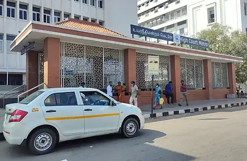 High Court is an underground metro station on the North-South Corridor of the Blue Line of Chennai Metro in Chennai, India. The station serves the neighbourhoods of George Town, chiefly Parry's Corner. This station is named so because of the presence of the Madras High Court in the vicinity. This station was opened for public on 10 February 2019. However, some portions of the construction work remains incomplete on the date of inauguration.[1]