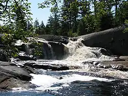 At the falls the Oswegatchie flows northwest over glaciated granite gneiss bedrock.[3] They are surrounded by white pine forest, somewhat more open than one might expect in an area characterized as old growth forest. However windstorms in 1950[4] and in 1995[5] devastated this part of the Five Ponds Wilderness. The region has been logged and remnants from that era may be found nearby. A logging railroad once ran between Wanakena and High Falls.[6] The Rich Lumber Company built the standard gauge railroad along the Oswegatchie River about 1902 and operated it until 1912.[7][8][9] That part of the Five Ponds Wilderness to the south of High Falls still has the largest area of virgin forest in the US Northeast however. It is also the largest trailless area in New York state.[10]