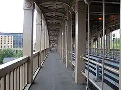 Between 1955 and 1959, the timber deck of the rail level was replaced by steel, and ballasted track was substituted for the earlier way beam track structure, adding 150 tons of dead load to each span of the bridge.