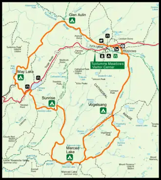 The May Lake High Sierra Camp is a hiking distance of 8.6 miles (13.8 km) southwest, and Tuolumne Meadows Lodge is a hiking distance of 7.6 miles (12.2 km) southeast.[2]
