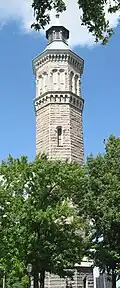 The High Bridge Water Tower, in the park between West 173rd and 174th Streets, was built in 1866–1872 to help meet the increasing demands on the city's water system. The 200-foot (61 m)-tall octagonal tower was designed by John B. Jervis in a mixture of Romanesque Revival and neo-Grec styles, and was accompanied by the 7-acre (2.8 ha) Highbridge Reservoir. The High Bridge system was inaugurated in 1872, and reached its full capacity by 1875.[47] With the opening of the Croton Aqueduct, the High Bridge system became less relied upon; during World War I it was taken out of service when sabotage was feared.[47] In 1949 the tower was disconnected from the system,[47][72] and a carillon, donated by the Altman Foundation, was installed in 1958.[47] The tower's cupola was damaged by an arson fire in 1984. The tower and cupola were rehabilitated and restored in 1989–1990.[47] The High Bridge Water Tower was designated a New York City landmark by the Landmarks Preservation Commission in 1967. The High Bridge Water Tower underwent a 10 year, $5 million renovation, and reopened to the public for scheduled tours in November 2021. [73] Tours are free through NYC Parks Department and usually take place several times a month.