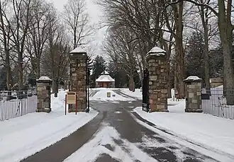 Highland Cemetery covers about 80 acres, with a rolling, sloped topography which includes knolls, valleys, and ravines. The cemetery is located in a wooded area of oak, pine, cedar and willow trees.[2] As designed by Glenn, the cemetery features curved paths through stands of trees.[4] The entrance to the cemetery is located at 943 N. River St.[5] The gates at the cemetery entrance are constructed of decorative wrought iron and measure 10 feet (3.0 m) high and 81 inches (2.1 m) wide.[6]