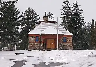A number of structures dating from 1880-1925 are included on the grounds. The cemetery is the site of the Starkweather Memorial Chapel which was commissioned by Mary Ann Starkweather to honor her husband. The chapel, an example of Richardsonian Romanesque style, was designed by George D. Mason and completed in 1889.[3][6][7] The cemetery also includes two Civil War memorials. One, known as the Ypsilanti Civil War Memorial, features an inscription stating it was donated by Mary Ann Starkweather. The other, the Ypsilanti Black Civil War Monument, honors the contributions of United States Colored Troops (USCT). Around 40 graves within the cemetery are believed to belong to Black Civil War veterans.