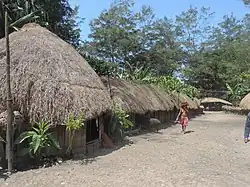 The traditional food of Papuan from the Central Highland, usually consists of roasted boar with Tubers such as sweet potato (hipere) as the staple food.[74] This is unlike the staple foods in the lowlands of Western New Guinea and eastern Indonesia in general with sago, or western Indonesian cuisines that favour rice as their staple food.[75] In Highland Papua, pig roast which consists of pork and yams are roasted in heated stones placed in a hole dug in the ground and covered with leaves; this cooking method is called bakar batu (burning the stone), and it is an important cultural and social event among Papuan people.[76] In some Papuan communities who are Muslim or when welcoming Muslim guests, pork can be replaced with chicken or beef or mutton or can be cooked separately with pork. This is, for example, practiced by the Welesi and Meteo communities in Jayawijaya Regency to welcome the holy month of Ramadan.[77]