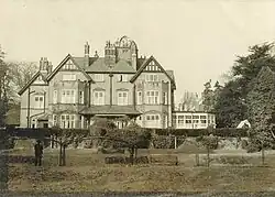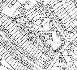 Highlands House was built in 1897 for the banker Joseph Bevan Braithwaite (1855-1934) who is thought to have designed the gardens. The house was south facing on high ground that overlooked Leicester Road, New Barnet. Braithwaite was an amateur astronomer who had a copper-domed observatory built at the house with a telescope on rails offering 360 degree views of the sky.[3] During the Second World War, the dome was painted black in order to prevent it being visible to enemy aircraft in moonlight.[1]
