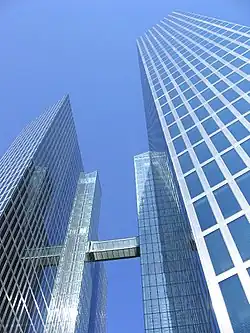 Highlight Towers is a twin tower office skyscraper complex completed in 2004 in Munich, Germany, planned by architects Murphy/Jahn of Chicago. Tower I is 126 m (413 ft) tall with 33 storeys, and Tower II is 113 m (371 ft) tall with 28 storeys, which make them among the highest buildings in the city. The towers are joined by two skyways made of glass and steel. Also in the complex are two low-rise buildings between the twin towers, that serve as a hotel and additional office space. Overall, the facility offers approximately 73,836 m2 (794,760 sq ft) of office space.