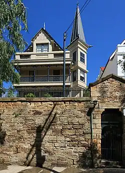 Highroyd was built by John Young, a builder who migrated from England in 1855 and worked in the state of Victoria for some time before settling in Sydney in 1866. Young was responsible for building a number of heritage buildings in Sydney, including St Mary's Cathedral and St Francis Xavier's War Memorial Church in North Sydney.[2] In 1877 he bought a parcel of land near Rozelle Bay, in the area now known as Annandale. His dream was to create a prestige suburb that would rival other exclusive residential areas in Sydney. The main street in this new area, Johnston Street, was intended to be "the finest street in the colony."[3] On the west side of Johnston Street he built a group of eight large, idiosyncratic houses. At the head of this group was The Abbey, a sandstone Gothic mansion loosely modelled on a Scottish manor. It has been described as being "among that special breed of Free Gothic landmark buildings which once seen are not easily forgotten."[4] The Abbey was intended to be a home for Young and his wife, but in fact they never lived there. Their home was a house called Kentville, near Rozelle Bay, which has since been demolished.