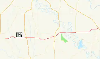 Highway 114 was created on April 1, 1926 as one of the original state highways.[2] The route ran east from State Road 11 at Fresno through Gould to Douglas. A second route was created in Cleveland County between Highway 35 and Calmer in July 1957.[4] The gap between Calmer and Star City was closed in March 1962.[5] Within Star City, Highway 114 was rerouted from Bradley Street to Arkansas Avenue upon completion of a widening project in 1967.[6] In 2015, the section between US 65 and Douglas was removed from the state highway system.[7]