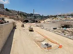 Construction works for the Yefe Nof tunnel and the Beyth intersection. In the background, left to right: Bayit VeGan neighborhood, Shaare Zedek hospital, Ramat Beit Hakerem neighborhood