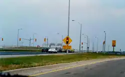 Highway 409 begins at Airport Road as the knotted flyovers from Pearson International Airport converge into the freeway from the various terminals.[2] The highway then turns northeast and encounters Highway 427. Through this section to Highway 427, the highway is maintained by the Greater Toronto Airport Authority (GTAA) and has a posted speed limit of 60 kilometres per hour (37 mph).[4][5]