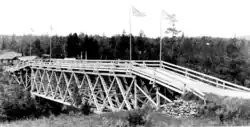 In response, the Rotary Clubs of Port Arthur and Duluth met to discuss a solution. As an international crossing, any bridge over the river would require federal approval from both governments. Both sides agreed that the approval process would be too slow, and decided to construct the bridge regardless. "The Outlaw" bridge was opened by a travelling motorcade on August 18, 1917, finally permitting travel between Ontario and Minnesota.[10] To the surprise of the Rotary Clubs, J. E. Whitson, Roads Commissioner of Northern Ontario, and Howard Ferguson, Minister of Lands, Forest and Mines, were present at the opening, and agreed to pay the $768,000 ($15.3 million in 2023[11]) bridge cost.[8] The bridge and the Canadian road approaching it fell under the jurisdiction of the Department of Highways (now the Ministry of Transportation) on April 1, 1937, and the Scott Highway became Highway 61 on October 6.[2] The Outlaw was rebuilt as a steel truss structure in 1934 following several accidents.[8]