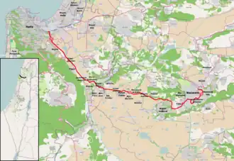 Commonly known as the Haifa–Nazareth Highway, Highway 75 begins in its confluence with Highway 22 just east of Downtown Haifa, from where it stretches as an elevated carriageway through the industrial area of East Haifa Bay just above sea level, where it crosses Road 4. It then runs south-eastward for about ten kilometers passing below the steep northeast slopes of the Carmel Range. At Amakim Junction, the road turns east, rising to about 160m above sea level. as it passes through Kiryat Tiv'on. It then descends crossing the northern edge of the Jezreel Valley. It ascends to 265 m. passing just north of Migdal HaEmek, and to over 300 m. as it enters Yafia and the natural bowl of the Nazareth Range of the Lower Galilee.