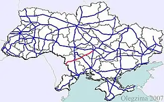Main route and connections to/intersections with other highways in Ukraine.