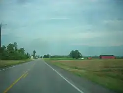 NY 5 is a busy east–west route that enters Genesee County and the town of Pembroke from Erie County and the town of Newstead. It is named Main Street when it enters the county and intersects NY 77 in Pembroke. NY 5 travels through predominantly rural areas until reaching the city of Batavia where it intersects NY 98 and also runs concurrent with NY 63 and NY 33 for a short distance through the city. NY 5 closely parallels I-90 (the New York State Thruway) through much of the county. The road travels eastward, intersecting NY 237 in Stafford and NY 19 in the village of Le Roy before leaving Genesee County and entering Livingston County and the village of Caledonia.