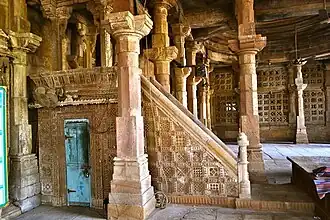 The qibla portico, or the prayer hall, is divided into three aisles parallel to the qibla wall separating each aisle from the other by a row of columns (arcade). The central aisle features the largest slab among them, covering five shallow domes of the same height except for the one in the middle, which covers the main mihrab area. It rises about 2.1 metres (7 ft) higher than the others and is distinguished by a Jali screen in the square area; the domes stand on eight pillars in the central aisle.[1] The Jali screen in the square area of the central dome allows sunlight to enter towards the area of the mihrab, in addition to serving as a ventilation and air purification mechanism. The qibla wall contains five mihrabs, and the main mihrab is located in the central Qibla wall. Only three mihrabs which are in the central have buttresses outside the qibla wall,[1][7] which serve as architectural supports for the qibla wall. The mihrabs are distinguished by their intricate micro-architectural decoration, which is unique among surviving mosques in Western India. The mihrabs feature a coherent and self-referencing micro-architectural decoration, including miniature copies of the mosque's central mihrab above the entrance door.[8] The mosque had inscriptions which were filled the panels over the mihrabs, but all of them disappeared, except the foundation inscription at the top of the main mihrab, which contained the name of the patron and the name of the Sultan in Delhi, the capital of the Sultanate. The foundation inscription is one of the most essential inscriptions in the Gujrat area, but it was formed in poor calligraphy. The inscription mentions another significant name which is the architect of the mosque ‘Abd-al-Karim Latif.[1]