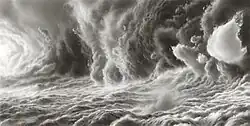 "Brace’s fictional spaces depict nameless, placeless spectacles staged by clouds but suggesting such continuity between states of matter - solid, liquid and gaseous – that they are equally convincing as skyscapes, seascapes or sometimes landscapes."[8] In Brace's words, as a drawing develops, the image "moves from vague suggestion to refinement as a remote, nascent world takes on a clear and obtainable presence."[9] Writing for the Los Angeles Times, Christopher Knight stated that “the feeling is less one of romantic yearning for something up there, out of reach, than it is full immersion in something stunning, primordial and elusive but immediately at hand.” [10] Despite their small scale, as Leah Ollman observed in Art in America, these drawings “suggest a vastness at the opposite end of the experiential spectrum, scaled more to the imagination than to the body. What Brace’s stunning little drawings do is put those two realms– the private and the cosmic – within reach of each other.”[11]