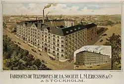 In the same year as their wedding, Lars Magnus Ericsson and Carl Johan Andersson, one of his former colleagues, founded a mechanical workshop for repairing telephones, the L.M. Ericsson & Co. Mekaniska Verkstad.[2] It was located in Drottninggatan in Stockholm.
