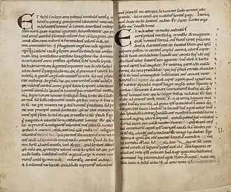 Hildegard's Lingua ignota ('unknown language') consisted of a series of invented words that corresponded to an eclectic list of nouns. The list is approximately 1,000 nouns; there are no other parts of speech.[79] The two most important sources for the Lingua ignota are the Wiesbaden, Hessische Landesbibliothek 2 (nicknamed the Riesenkodex)[79] and the Berlin manuscript.[42] In both manuscripts, medieval German and Latin glosses are written above Hildegard's invented words. The Berlin manuscript contains additional Latin and German glosses not found in the Riesenkodex.[42] The first two words of the Lingua as copied in the Berlin manuscript are aigonz (German, goth; Latin, deus; English, god) and aleganz (German, engel; Latin, angelus; English, angel).[80]