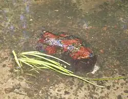 It may be confused with other algae forming crustose thalli on rocks, such as the brown algae Heribaudiella fluviatilis.[11] In saline waters, including the entire Baltic Sea, its variants are usually other species of Hildenbrandia (especially Hildenbrandia rubra), although it may co-occur with them in the brackish Bothnian Bay.[12]
