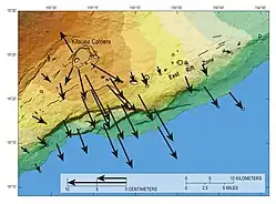 The rift zones enable transport of lava tens of kilometers away from the caldera (as seen in the 2018 lower Puna eruption). They also serve as wedges, forcing the south flank of Kīlauea downslope across a décollement – a nearly horizontal fault where the volcanic deposits rest on the oceanic crust[18] – about 8 to 10 km deep.[19] The combination of rifting and gravitationally driven slumping results in seaward movement of the entire south flank (see image), especially around the Hilina Pali, with seaward motions of up to 10 centimeters (3.9 inches) per year.[20]